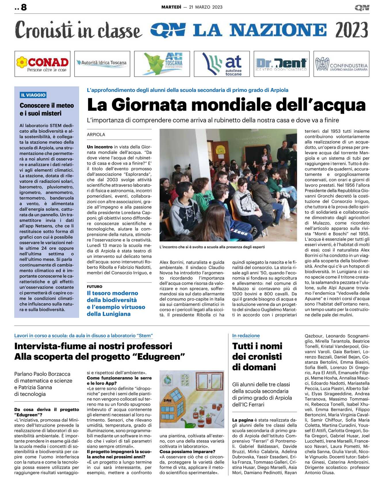 Un incontro in vista della Giornata mondiale dell’acqua. “Da dove viene l’acqua del rubinetto di casa e dove va a finire?“ E’ il titolo dell’evento promosso dall’associazione “Esploranda”, che dal 2003 svolge attività scientifiche attraverso laboratori di fisica e astronomia, incontri pomeridiani, eventi, collaborazioni con altre associazioni, grazie all’impegno e alla passione della presidente Loredana Capponi; gli obiettivi sono diffondere conoscenze scientifiche e tecnologiche, aiutare la comprensione della natura, stimolare l’osservazione e la creatività. Lunedì 13 marzo la scuola media di Arpiola è stata teatro di un intervento sul delicato tema dell’acqua: sono intervenuti Roberto Ribolla e Fabrizio Nadotti, membri del Consorzio Irriguo, e Alex Borrini, naturalista e guida ambientale. Il sindaco Claudio Novoa ha introdotto l’argomento ricordando l’importanza dell’acqua come risorsa da valorizzare e non sprecare, soffermandosi sia sul dato allarmante del consumo pro-capite in Italia sia sui cambiamenti climatici in corso e i pericoli legati alla siccità. Il presidente Ribolla ci ha quindi spiegato la nascita e le finalità del consorzio. La storia risale agli anni ’50, quando l’economia si fondava su agricoltura e allevamento: nel comune di Mulazzo si contavano più di 1200 bovini e 800 cavalli. Da qui il grande bisogno di acqua e la soluzione venne da un progetto del sindaco Guglielmo Mariotti in accordo con i proprietari terrieri: dal 1953 tutti insieme contribuirono volontariamente alla realizzazione di un acquedotto, un’opera di presa per prelevare acqua dal torrente Mangiola e un sistema di tubi per raggiungere i terreni. Tutto è documentato da quaderni, accuratamente e orgogliosamente conservati, con orari e giorni di lavoro prestati. Nel 1956 l’allora Presidente della Repubblica Giovanni Gronchi decretò la costituzione del Consorzio Irriguo, che tuttora è la prova dello spirito di solidarietà e collaborazione dimostrato dagli agricoltori di Mulazzo, come ricordato nell’articolo apparso sulla rivista “Monti e Boschi” nel 1955. L’acqua è essenziale per tutti gli esseri viventi, è l’habitat di molti di essi; così il naturalista Alex Borrini ci ha condotto in un viaggio alla scoperta della biodiversità. Anche qui c’è un hotspot di biodiversità. In Lunigiana ci sono specie come il tritone crestato, la salamandra pezzata e l’ululone, sulle Alpi Apuane troviamo l’endemica “Vedovella delle Apuane” e i nostri corsi d’acqua sono l’habitat dell’ontano nero, un tempo usato per la costruzione delle pale dei mulini.