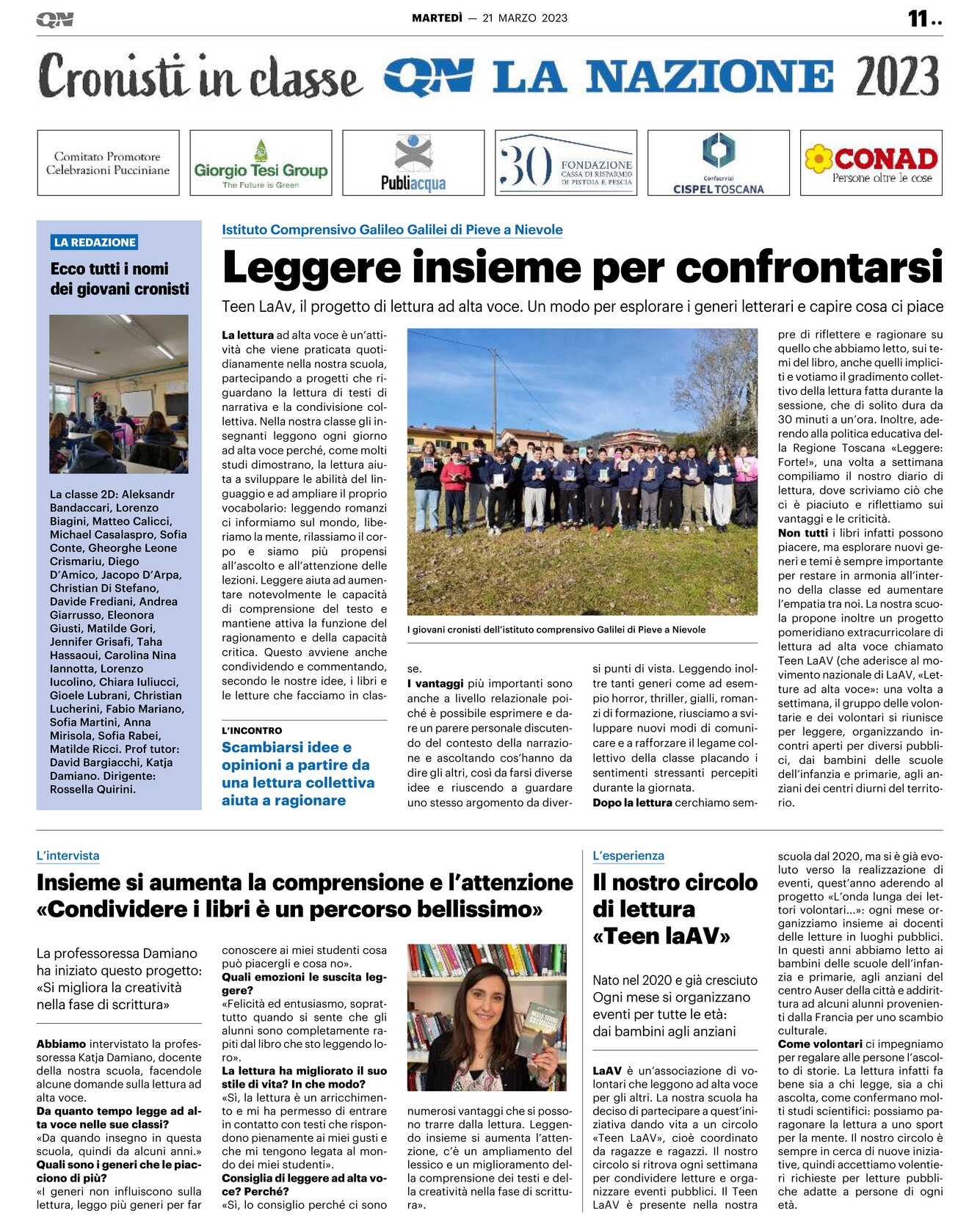 LaAV è un’associazione di volontari che leggono ad alta voce per gli altri. La nostra scuola ha deciso di partecipare a quest’iniziativa dando vita a un circolo «Teen LaAV», cioè coordinato da ragazze e ragazzi. Il nostro circolo si ritrova ogni settimana per condividere letture e organizzare eventi pubblici. Il Teen LaAV è presente nella nostra scuola dal 2020, ma si è già evoluto verso la realizzazione di eventi, quest’anno aderendo al progetto «L’onda lunga dei lettori volontari…»: ogni mese organizziamo insieme ai docenti delle letture in luoghi pubblici. In questi anni abbiamo letto ai bambini delle scuole dell’infanzia e primarie, agli anziani del centro Auser della città e addirittura ad alcuni alunni provenienti dalla Francia per uno scambio culturale. Come volontari ci impegniamo per regalare alle persone l’ascolto di storie. La lettura infatti fa bene sia a chi legge, sia a chi ascolta, come confermano molti studi scientifici: possiamo paragonare la lettura a uno sport per la mente. Il nostro circolo è sempre in cerca di nuove iniziative, quindi accettiamo volentieri richieste per letture pubbliche adatte a persone di ogni età.