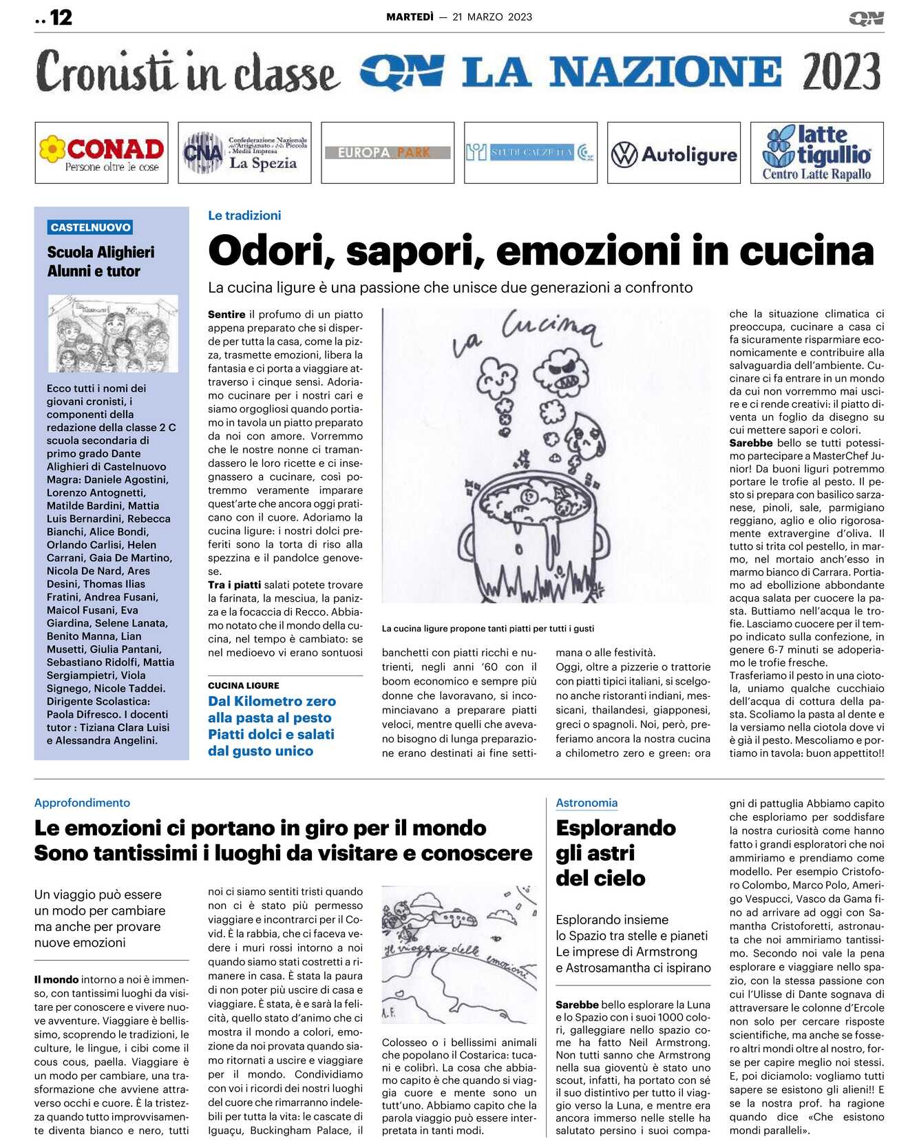 Ecco tutti i nomi dei giovani cronisti, i componenti della redazione della classe 2 C scuola secondaria di primo grado Dante Alighieri di Castelnuovo Magra: Daniele Agostini, Lorenzo Antognetti, Matilde Bardini, Mattia Luis Bernardini, Rebecca Bianchi, Alice Bondi, Orlando Carlisi, Helen Carrani, Gaia De Martino, Nicola De Nard, Ares Desini, Thomas Ilias Fratini, Andrea Fusani, Maicol Fusani, Eva Giardina, Selene Lanata, Benito Manna, Lian Musetti, Giulia Pantani, Sebastiano Ridolfi, Mattia Sergiampietri, Viola Signego, Nicole Taddei.