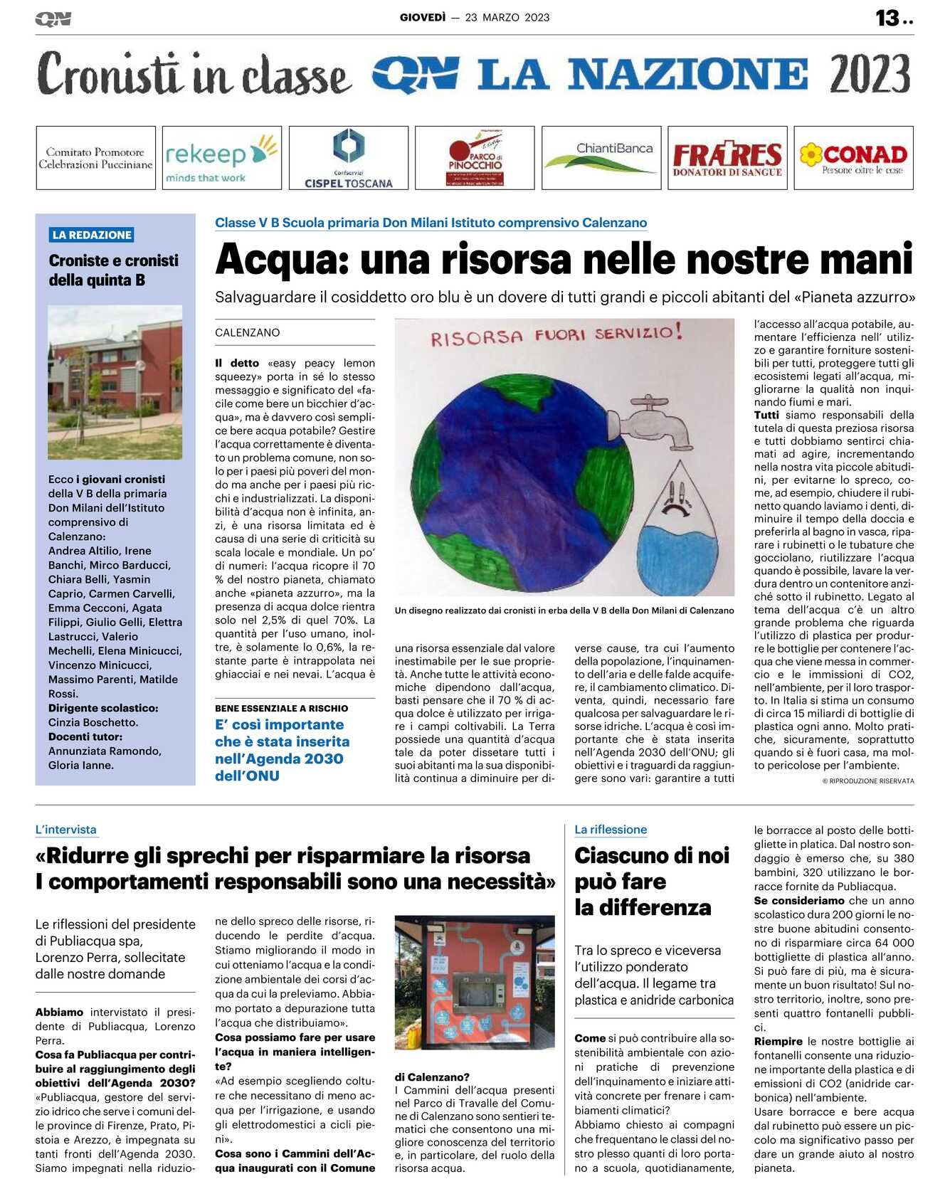 Abbiamo intervistato il presidente di Publiacqua, Lorenzo Perra. Cosa fa Publiacqua per contribuire al raggiungimento degli obiettivi dell’Agenda 2030? «Publiacqua, gestore del servizio idrico che serve i comuni delle province di Firenze, Prato, Pistoia e Arezzo, è impegnata su tanti fronti dell’Agenda 2030. Siamo impegnati nella riduzione dello spreco delle risorse, riducendo le perdite d’acqua. Stiamo migliorando il modo in cui otteniamo l’acqua e la condizione ambientale dei corsi d’acqua da cui la preleviamo. Abbiamo portato a depurazione tutta l’acqua che distribuiamo». Cosa possiamo fare per usare l’acqua in maniera intelligente? «Ad esempio scegliendo colture che necessitano di meno acqua per l’irrigazione, e usando gli elettrodomestici a cicli pieni». Cosa sono i Cammini dell’Acqua inaugurati con il Comune di Calenzano? I Cammini dell’acqua presenti nel Parco di Travalle del Comune di Calenzano sono sentieri tematici che consentono una migliore conoscenza del territorio e, in particolare, del ruolo della risorsa acqua.