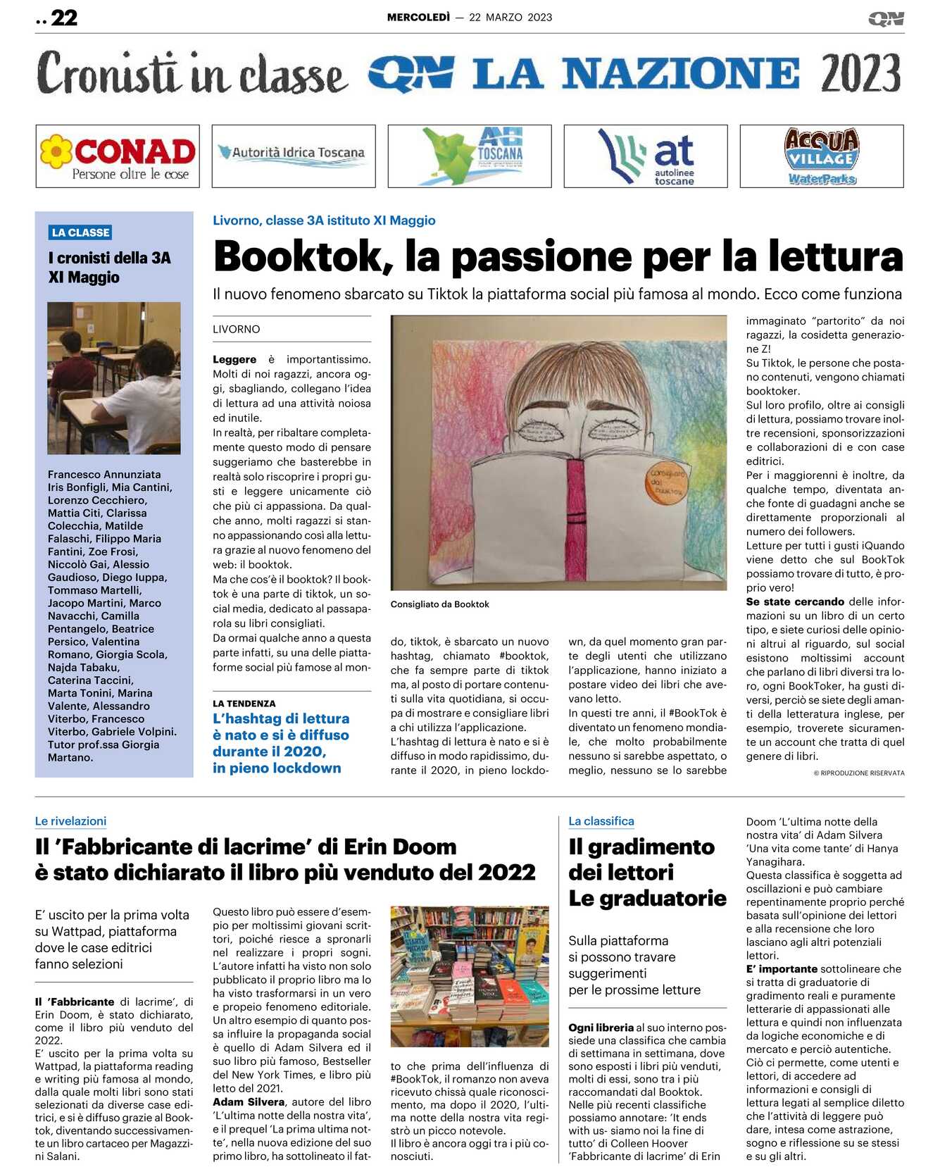 .Il ’Fabbricante di lacrime’, di Erin Doom, è stato dichiarato, come il libro più venduto del 2022. E’ uscito per la prima volta su Wattpad, la piattaforma reading e writing più famosa al mondo, dalla quale molti libri sono stati selezionati da diverse case editrici, e si è diffuso grazie al Booktok, diventando successivamente un libro cartaceo per Magazzini Salani. Questo libro può essere d’esempio per moltissimi giovani scrittori, poiché riesce a spronarli nel realizzare i propri sogni. L’autore infatti ha visto non solo pubblicato il proprio libro ma lo ha visto trasformarsi in un vero e proprio fenomeno editoriale. Un altro esempio di quanto possa influire la propaganda social è quello di Adam Silvera ed il suo libro più famoso, Bestseller del New York Times, e libro più letto del 2021. Adam Silvera, autore del libro ’L’ultima notte della nostra vita’, e il prequel ’La prima ultima notte’, nella nuova edizione del suo primo libro, ha sottolineato il fatto che prima dell’influenza di #BookTok, il romanzo non aveva ricevuto chissà quale riconoscimento, ma dopo il 2020, l’ultima notte della nostra vita registrò un picco notevole. Il libro è ancora oggi tra i più conosciuti.