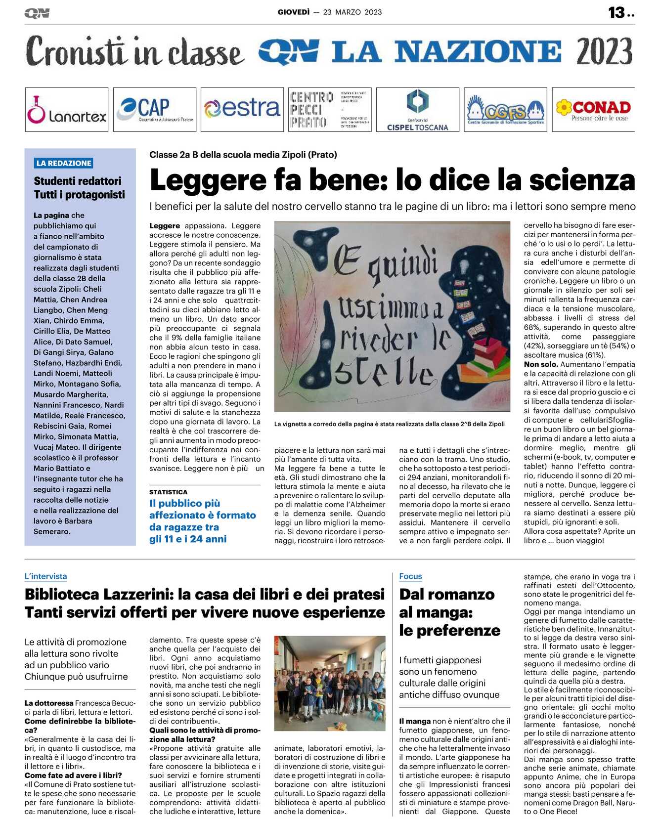 La pagina che pubblichiamo qui a fianco nell’ambito del campionato di giornalismo è stata realizzata dagli studenti della classe 2B della scuola Zipoli: Cheli Mattia, Chen Andrea Liangbo, Chen Meng Xian, Chirdo Emma, Cirillo Elia, De Matteo Alice, Di Dato Samuel, Di Gangi Sirya, Galano Stefano, Hazbardhi Endi, Landi Noemi, Matteoli Mirko, Montagano Sofia, Musardo Margherita, Nannini Francesco, Nardi Matilde, Reale Francesco, Rebiscini Gaia, Romei Mirko, Simonata Mattia, Vucaj Mateo. Il dirigente scolastico è il professor Mario Battiato e l’insegnante tutor che ha seguito i ragazzi nella raccolta delle notizie e nella realizzazione del lavoro è Barbara Semeraro.
