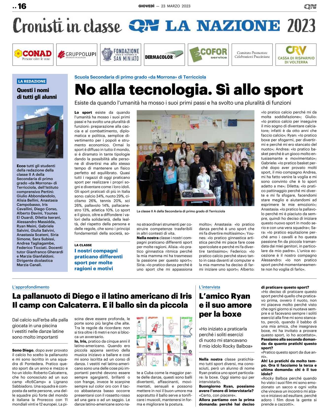 Ecco tutti gli studenti della redazione della classe II A della Secondaria di primo grado «da Morrona» di Terricciola, dell’Istituto comprensivo Pertini: Giulio Abbondandolo, Alisia Bellini, Anastasia Campobasso, Iris Cavallini, Diego Corso, Alberto Davini, Younes El Ouardi, Diletta Iserani, Alessandro Massidda, Ryan Meini, Gabriele Salvini, Giulia Salvini, Anastasia Scateni, Siria Simone, Sara Subissi, Andrea Tagliagambe, Federico Ticciati. Docenti tutor Gianfranco Gherardi e Marzia Gianfaldoni.