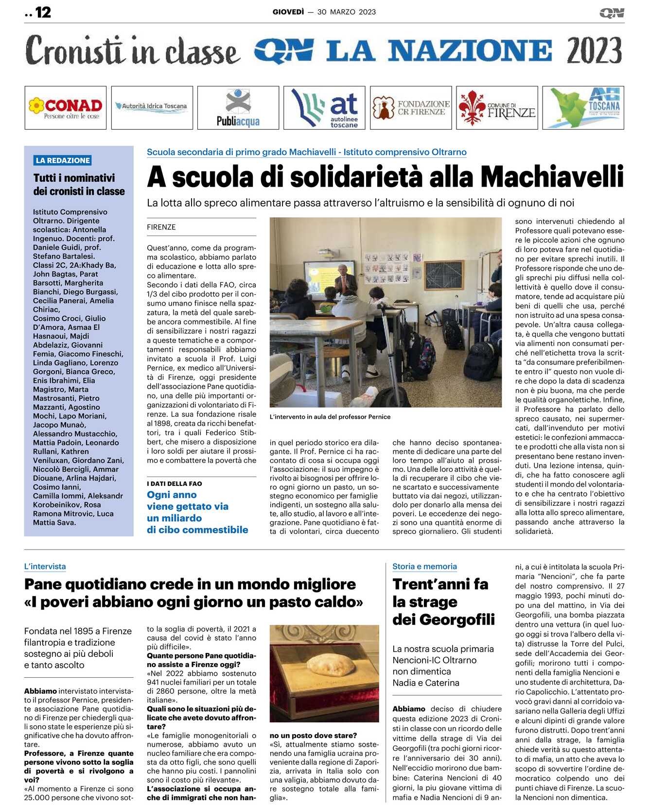 Quest’anno, come da programma scolastico, abbiamo parlato di educazione e lotta allo spreco alimentare. Secondo i dati della FAO, circa 1/3 del cibo prodotto per il consumo umano finisce nella spazzatura, la metà del quale sarebbe ancora commestibile. Al fine di sensibilizzare i nostri ragazzi a queste tematiche e a comportamenti responsabili abbiamo invitato a scuola il Prof. Luigi Pernice, ex medico all’Università di Firenze, oggi presidente dell’associazione Pane quotidiano, una delle più importanti organizzazioni di volontariato di Firenze. La sua fondazione risale al 1898, creata da ricchi benefattori, tra i quali Federico Stibbert, che misero a disposizione i loro soldi per aiutare il prossimo e combattere la povertà che in quel periodo storico era dilagante. Il Prof. Pernice ci ha raccontato di cosa si occupa oggi l’associazione: il suo impegno è rivolto ai bisognosi per offrire loro ogni giorno un pasto, un sostegno economico per famiglie indigenti, un sostegno alla salute, allo studio, al lavoro e all’integrazione. Pane quotidiano è fatta di volontari, circa duecento che hanno deciso spontaneamente di dedicare una parte del loro tempo all’aiuto al prossimo. Una delle loro attività è quella di recuperare il cibo che viene scartato e successivamente buttato via dai negozi, utilizzandolo per donarlo alla mensa dei poveri. Le eccedenze dei negozi sono una quantità enorme di spreco giornaliero. Gli studenti sono intervenuti chiedendo al Professore quali potevano essere le piccole azioni che ognuno di loro poteva fare nel quotidiano per evitare sprechi inutili. Il Professore risponde che uno degli sprechi più diffusi nella collettività è quello dove il consumatore, tende ad acquistare più beni di quelli che usa, perché non istruito ad una spesa consapevole. Un’altra causa collegata, è quella che vengono buttati via alimenti non consumati perché nell’etichetta trova la scritta “da consumare preferibilmente entro il” questo non vuole dire che dopo la data di scadenza non è più buona, ma che perde le qualità organolettiche. Infine, il Professore ha parlato dello spreco causato, nei supermercati, dall’invenduto per motivi estetici: le confezioni ammaccate e prodotti che alla vista non si presentano bene restano invenduti. Una lezione intensa, quindi, che ha fatto conoscere agli studenti il mondo del volontariato e che ha centrato l’obiettivo di sensibilizzare i nostri ragazzi alla lotta allo spreco alimentare, passando anche attraverso la solidarietà.