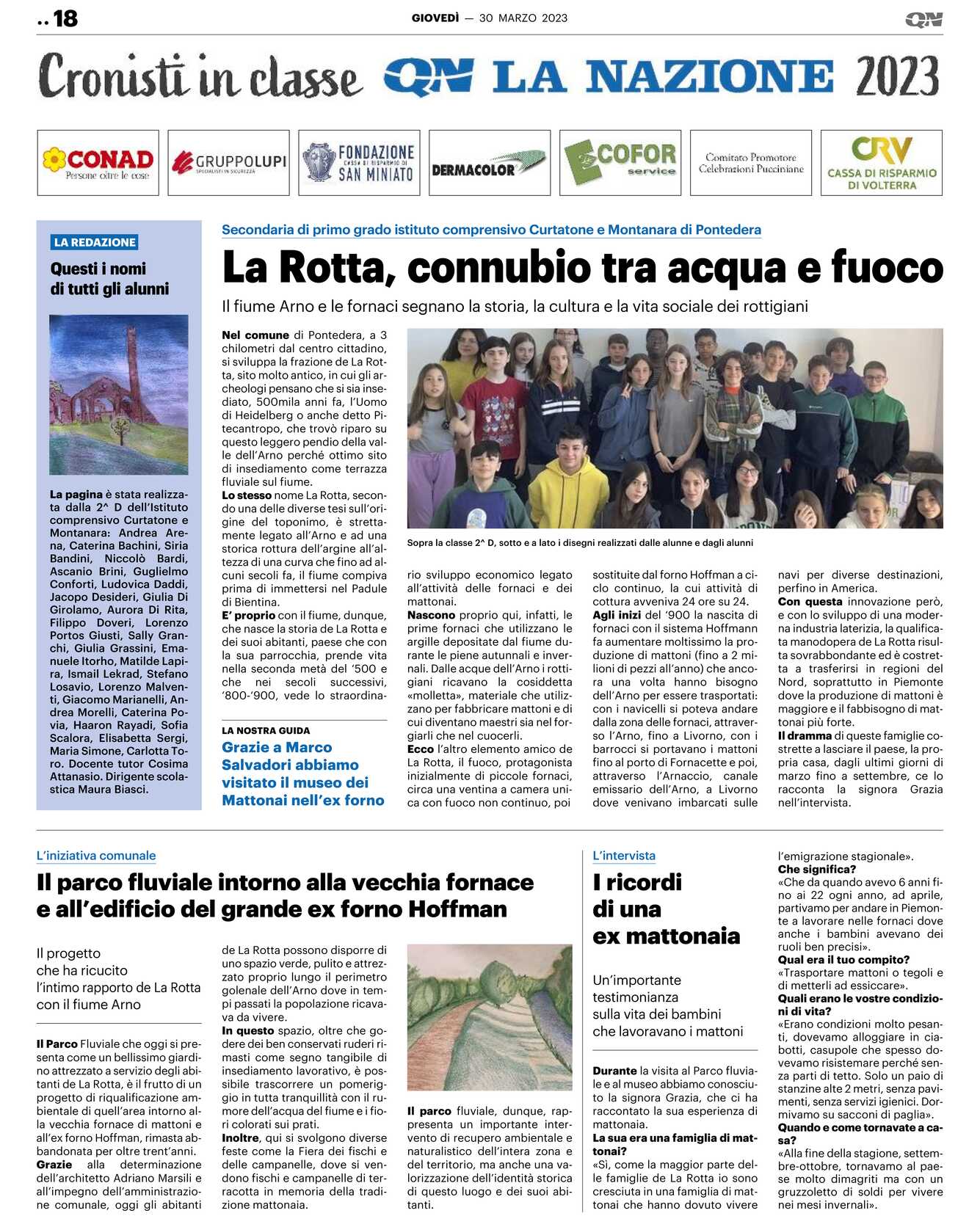 Durante la visita al Parco fluviale e al museo abbiamo conosciuto la signora Grazia, che ci ha raccontato la sua esperienza di mattonaia. La sua era una famiglia di mattonai? «Sì, come la maggior parte delle famiglie de La Rotta io sono cresciuta in una famiglia di mattonai che hanno dovuto vivere l’emigrazione stagionale». Che significa? «Che da quando avevo 6 anni fino ai 22 ogni anno, ad aprile, partivamo per andare in Piemonte a lavorare nelle fornaci dove anche i bambini avevano dei ruoli ben precisi». Qual era il tuo compito? «Trasportare mattoni o tegoli e di metterli ad essiccare». Quali erano le vostre condizioni di vita? «Erano condizioni molto pesanti, dovevamo alloggiare in ciabotti, casupole che spesso dovevamo risistemare perché senza parti di tetto. Solo un paio di stanzine alte 2 metri, senza pavimenti, senza servizi igienici. Dormivamo su sacconi di paglia». Quando e come tornavate a casa? «Alla fine della stagione, settembre-ottobre, tornavamo al paese molto dimagriti ma con un gruzzoletto di soldi per vivere nei mesi invernali».