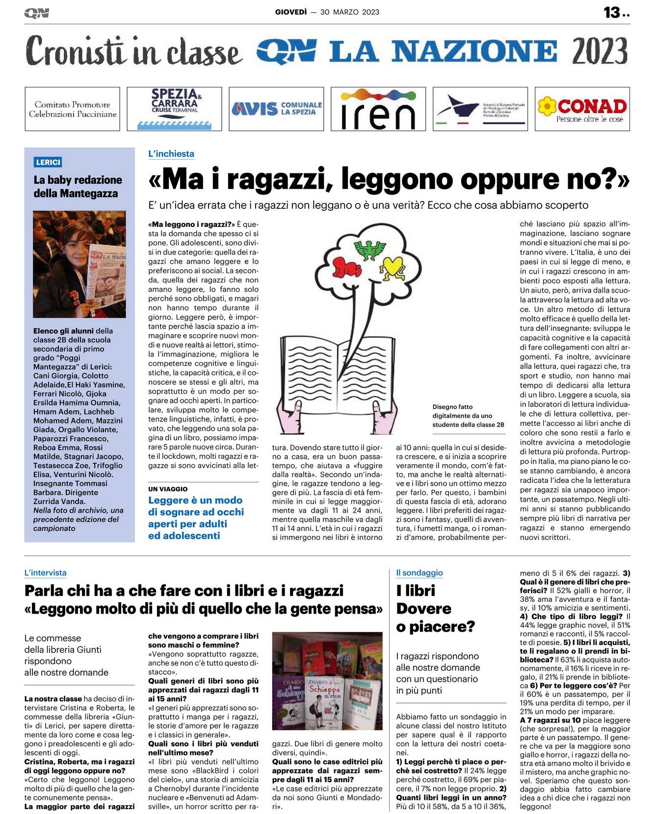 La nostra classe ha deciso di intervistare Cristina e Roberta, le commesse della libreria «Giunti» di Lerici, per sapere direttamente da loro come e cosa leggono i preadolescenti e gli adolescenti di oggi. Cristina, Roberta, ma i ragazzi di oggi leggono oppure no? «Certo che leggono! Leggono molto di più di quello che la gente comunemente pensa». La maggior parte dei ragazzi che vengono a comprare i libri sono maschi o femmine? «Vengono soprattutto ragazze, anche se non c’è tutto questo distacco». Quali generi di libri sono più apprezzati dai ragazzi dagli 11 ai 15 anni? «I generi più apprezzati sono soprattutto i manga per i ragazzi, le storie d’amore per le ragazze e i classici in generale». Quali sono i libri più venduti nell’ultimo mese? «I libri più venduti nell’ultimo mese sono «BlackBird i colori del cielo», una storia di amicizia a Chernobyl durante l’incidente nucleare e «Benvenuti ad Adamsville», un horror scritto per ragazzi. Due libri di genere molto diversi, quindi». Quali sono le case editrici più apprezzate dai ragazzi sempre dagli 11 ai 15 anni? «Le case editrici più apprezzate da noi sono Giunti e Mondadori».