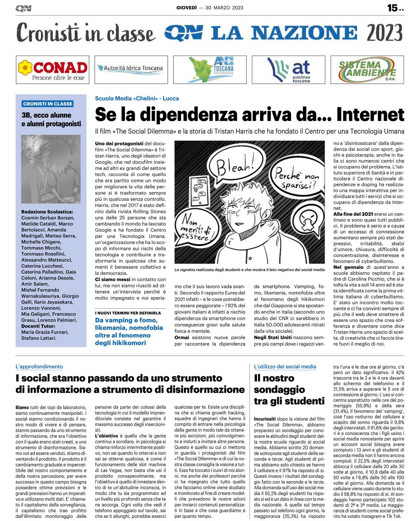 Uno dei protagonisti del docufilm «The Social Dilemma» è Tristan Harris, uno degli ideatori di Google, che nel docufilm insieme ad altri ex grandi del settore tech, racconta di come quello che era partito come un modo per migliorare la vita delle persone si è trasformato sempre più in qualcosa senza controllo. Harris, che nel 2017 è stato definito dalla rivista Rolling Stones una delle 25 persone che sta cambiando il mondo ha lasciato Google e ha fondato il Centro per una Tecnologia Umana, un’organizzazione che ha lo scopo di informare sui rischi della tecnologia e contribuire a trasformarla in qualcosa che aumenti il benessere collettivo e la democrazia. Ci siamo messi in contatto con lui, ma non siamo riusciti ad ottenere un’intervista perché è molto impegnato e noi speriamo che il suo lavoro vada avanti. Secondo il rapporto Eures del 2021 infatti – e le cose potrebbero essere peggiorate – l’82% dei giovani italiani è infatti a rischio dipendenza da smartphone con conseguenze gravi sulla salute fisica e mentale. Ormai esistono nuove parole per raccontare la dipendenza da smartphone. Vamping, fomo, likemania, nomofobia oltre al fenomeno degli hikikomori che dal Giappone si sta spostando anche in Italia (secondo uno studio del CNR ci sarebbero in Italia 50.000 adolescenti ritirati dalla vita sociale). Negli Stati Uniti nascono sempre più campi dove i ragazzi van-no a ‘disintossicarsi’ dalla dipendenza dai social con sport, giochi e psicoterapia, anche in Italia ci sono numerosi centri che si occupano del problema. L’Istituto superiore di Sanità e in particolare il Centro nazionale dipendenze e doping ha realizzato una mappa interattiva per individuare tutti i servizi che si occupano di dipendenza da Internet. Alla fine del 2021 erano un centinaio e sono quasi tutti pubblici. Il problema è serio e a causa di un eccesso di connessione aumentano sempre più stati depressivi, irritabilità, sbalzi d’umore, chiusura, difficoltà di concentrazione, disinteresse e fenomeni di cyberbullismo. Nel gennaio di quest’anno a scuola abbiamo ospitato il padre di Carolina Picchio, che si è tolta la vita a soli 14 anni ed è stata identificata come la prima vittima italiana di cyberbullismo. E’ stato un incontro molto toccante e ci ha convinti sempre di più che il web deve smettere di essere uno spazio che crea sofferenza e diventare come dice Tristan Harris uno spazio di scelta, di creatività che ci faccia tirare fuori il meglio di noi.