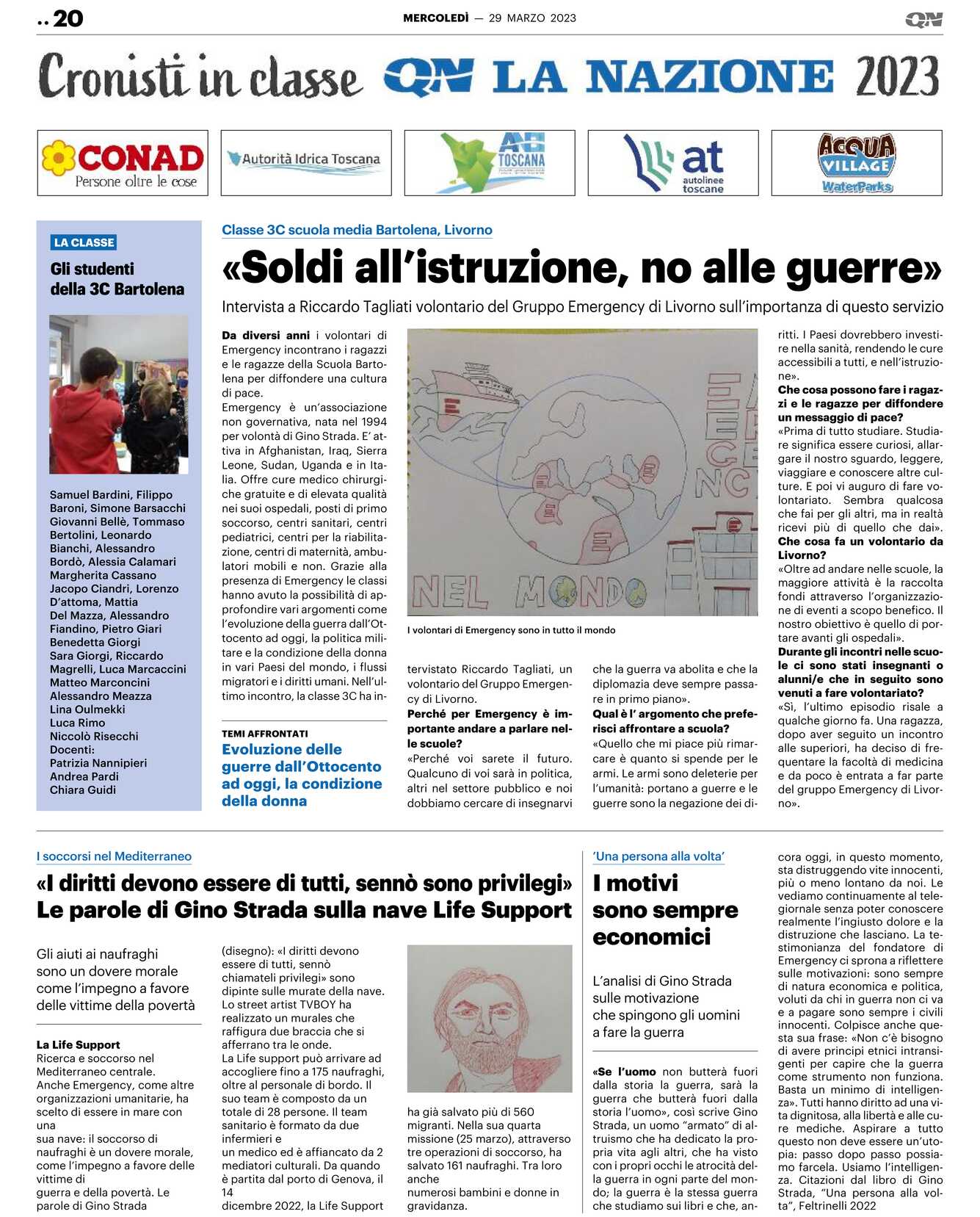 Da diversi anni i volontari di Emergency incontrano i ragazzi e le ragazze della Scuola Bartolena per diffondere una cultura di pace. Emergency è un’associazione non governativa, nata nel 1994 per volontà di Gino Strada. E’ attiva in Afghanistan, Iraq, Sierra Leone, Sudan, Uganda e in Italia. Offre cure medico chirurgiche gratuite e di elevata qualità nei suoi ospedali, posti di primo soccorso, centri sanitari, centri pediatrici, centri per la riabilitazione, centri di maternità, ambulatori mobili e non. Grazie alla presenza di Emergency le classi hanno avuto la possibilità di approfondire vari argomenti come l’evoluzione della guerra dall’Ottocento ad oggi, la politica militare e la condizione della donna in vari Paesi del mondo, i flussi migratori e i diritti umani. Nell’ultimo incontro, la classe 3C ha intervistato Riccardo Tagliati, un volontario del Gruppo Emergency di Livorno. Perché per Emergency è importante andare a parlare nelle scuole? «Perché voi sarete il futuro. Qualcuno di voi sarà in politica, altri nel settore pubblico e noi dobbiamo cercare di insegnarvi che la guerra va abolita e che la diplomazia deve sempre passare in primo piano». Qual è l’ argomento che preferisci affrontare a scuola? «Quello che mi piace più rimarcare è quanto si spende per le armi. Le armi sono deleterie per l’umanità: portano a guerre e le guerre sono la negazione dei di-ritti. I Paesi dovrebbero investire nella sanità, rendendo le cure accessibili a tutti, e nell’istruzione». Che cosa possono fare i ragazzi e le ragazze per diffondere un messaggio di pace? «Prima di tutto studiare. Studiare significa essere curiosi, allargare il nostro sguardo, leggere, viaggiare e conoscere altre culture. E poi vi auguro di fare volontariato. Sembra qualcosa che fai per gli altri, ma in realtà ricevi più di quello che dai». Che cosa fa un volontario da Livorno? «Oltre ad andare nelle scuole, la maggiore attività è la raccolta fondi attraverso l’organizzazione di eventi a scopo benefico. Il nostro obiettivo è quello di portare avanti gli ospedali». Durante gli incontri nelle scuole ci sono stati insegnanti o alunni/e che in seguito sono venuti a fare volontariato? «Sì, l’ultimo episodio risale a qualche giorno fa. Una ragazza, dopo aver seguito un incontro alle superiori, ha deciso di frequentare la facoltà di medicina e da poco è entrata a far parte del gruppo Emergency di Livorno».