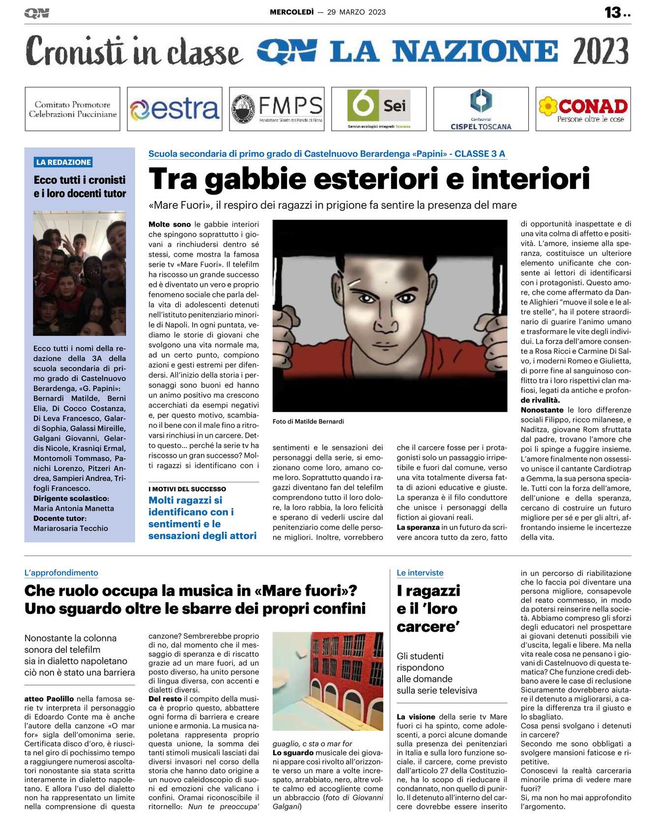 La visione della serie tv Mare fuori ci ha spinto, come adolescenti, a porci alcune domande sulla presenza dei penitenziari in Italia e sulla loro funzione sociale. il carcere, come previsto dall’articolo 27 della Costituzione, ha lo scopo di rieducare il condannato, non quello di punirlo. Il detenuto all’interno del carcere dovrebbe essere inserito in un percorso di riabilitazione che lo faccia poi diventare una persona migliore, consapevole del reato commesso, in modo da potersi reinserire nella società. Abbiamo compreso gli sforzi degli educatori nel prospettare ai giovani detenuti possibili vie d’uscita, legali e libere. Ma nella vita reale cosa ne pensano i giovani di Castelnuovo di questa tematica? Che funzione credi debbano avere le case di reclusione Sicuramente dovrebbero aiutare il detenuto a migliorarsi, a capire la differenza tra il giusto e lo sbagliato. Cosa pensi svolgano i detenuti in carcere? Secondo me sono obbligati a svolgere mansioni faticose e ripetitive. Conoscevi la realtà carceraria minorile prima di vedere mare fuori? Si, ma non ho mai approfondito l’argomento.