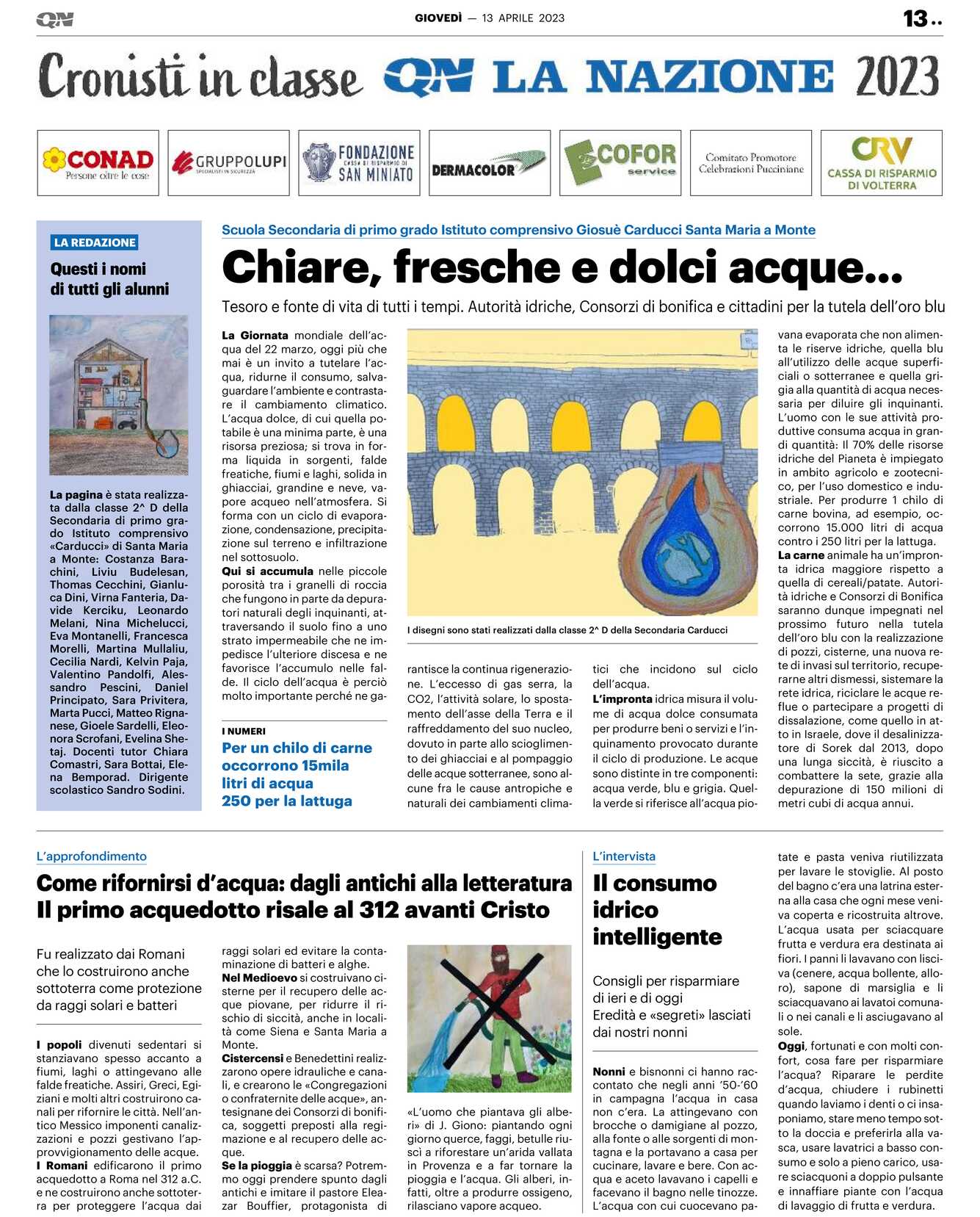Oggi, fortunati e con molti confort, cosa fare per risparmiare l’acqua? Riparare le perdite d’acqua, chiudere i rubinetti quando laviamo i denti o ci insaponiamo, stare meno tempo sotto la doccia e preferirla alla vasca, usare lavatrici a basso consumo e solo a pieno carico, usare sciacquoni a doppio pulsante e innaffiare piante con l’acqua di lavaggio di frutta e verdura.La pagina è stata realizzata dalla classe 2^ D della Secondaria di primo grado Istituto comprensivo «Carducci» di Santa Maria a Monte: Costanza Barachini,LiviuBudelesan,Thomas Cecchini, Gianluca Dini, Virna Fanteria, Davide Kerciku, Leonardo Melani, Nina Michelucci, Eva Montanelli, Francesca Morelli, Martina Mullaliu, Cecilia Nardi, Kelvin Paja, Valentino Pandolfi, AlessandroPescini,DanielPrincipato, Sara Privitera, Marta Pucci, Matteo Rignanese, Gioele Sardelli, Eleonora Scrofani, Evelina Shetaj. Docenti tutor Chiara Comastri, Sara Bottai, Elena Bemporad. Dirigente scolastico Sandro Sodini.LA REDAZIONE