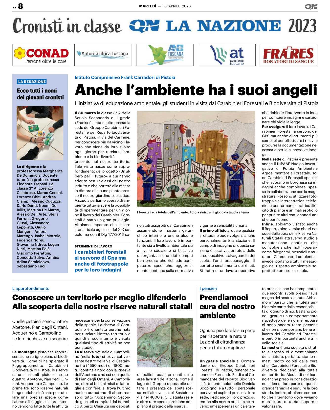 Un grazie speciale al Comandante del Gruppo Carabinieri Forestali di Pistoia, tenente colonnello Fernando Baldi e al Comandante del reparto Biodiversità, tenente colonnello Daniela Scopigno, e a tutto il personale per averci ospitati presso la loro sede, dedicando il loro prezioso tempo alla nostra crescita attraverso un’esperienza unica e tan-to preziosa che ha completato i due incontri svolti presso l’aula magna del nostro Istituto. Abbiamo imparato che la tutela ambientale parte dalla responsabilità di ognuno di noi. Bastano piccoli gesti e un comportamento rispettoso delle norme, eppure ci sono ancora tante persone che non si comportano bene e il lavoro dei Carabinieri Forestali è perciò importante anche a livello sociale.
