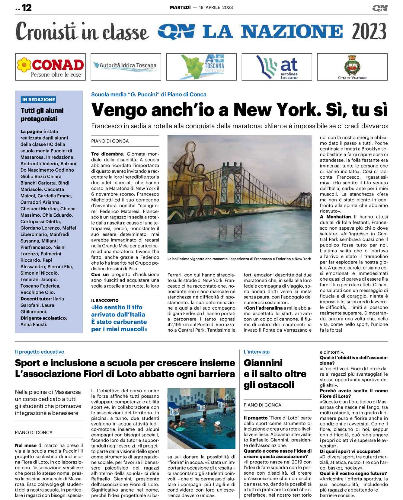 Tre dicembre: Giornata mondiale della disabilità. A scuola abbiamo ricordato l’importanza di questo evento invitando a raccontare la loro incredibile storia due atleti speciali, che hanno corso la Maratona di New York il 6 novembre scorso: Francesco Michelotti ed il suo compagno d’avventura nonché “spingitore“ Federico Mataresi. Francesco è un ragazzo in sedia a rotelle dalla nascita a causa di una tetraparesi, perciò, nonostante il suo essere determinato, mai avrebbe immaginato di recarsi nella Grande Mela per partecipare ad una maratona. Invece l’ha fatto, anche grazie a Federico che lo ha inserito nel Gruppo podistico Rossini di Pisa.
