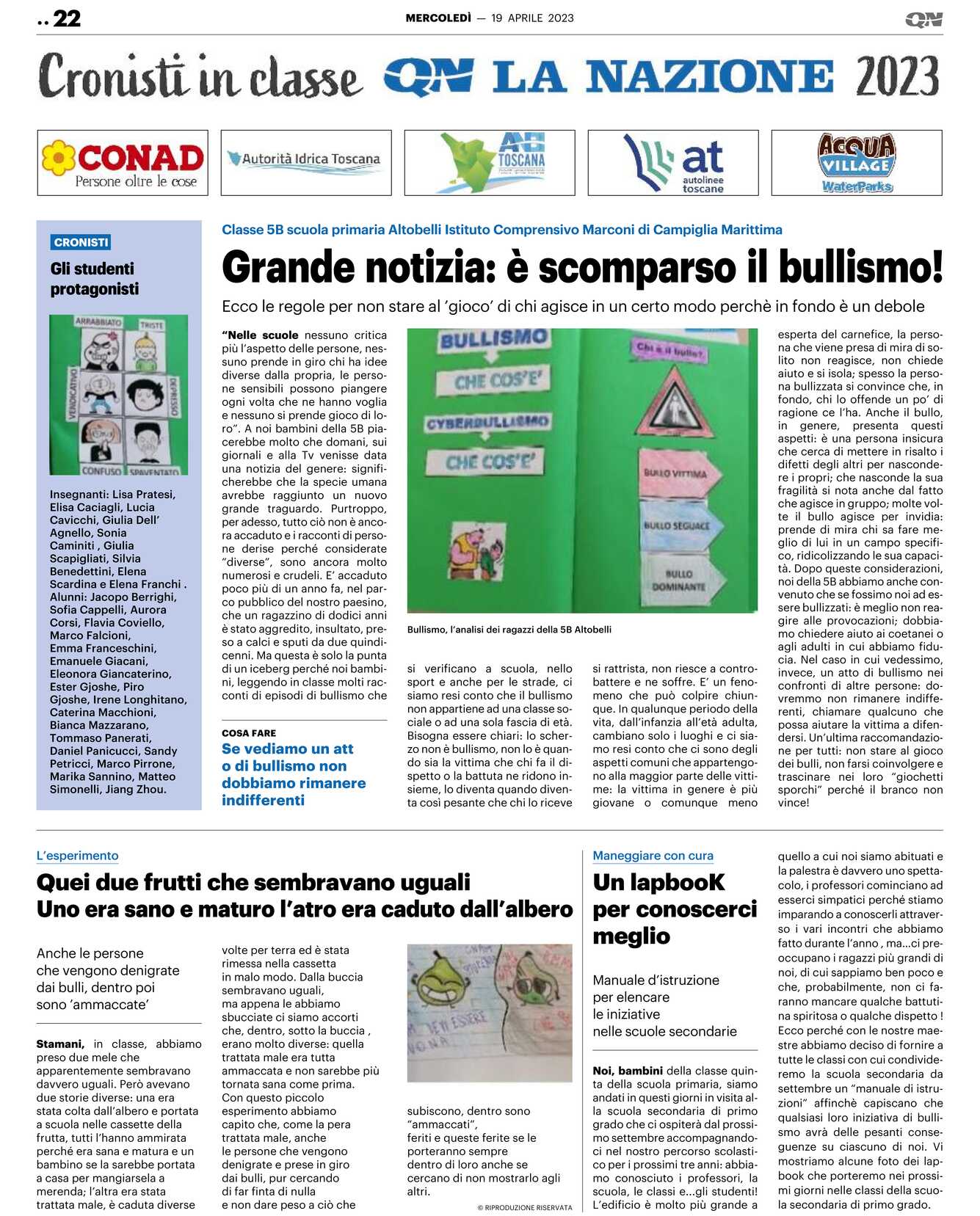 “Nelle scuole nessuno critica più l’aspetto delle persone, nessuno prende in giro chi ha idee diverse dalla propria, le persone sensibili possono piangere ogni volta che ne hanno voglia e nessuno si prende gioco di loro”. A noi bambini della 5B piacerebbe molto che domani, sui giornali e alla Tv venisse data una notizia del genere: significherebbe che la specie umana avrebbe raggiunto un nuovo grande traguardo. Purtroppo, per adesso, tutto ciò non è ancora accaduto e i racconti di persone derise perché considerate “diverse”, sono ancora molto numerosi e crudeli. E’ accaduto poco più di un anno fa, nel parco pubblico del nostro paesino, che un ragazzino di dodici anni è stato aggredito, insultato, preso a calci e sputi da due quindicenni. Ma questa è solo la punta di un iceberg perché noi bambini, leggendo in classe molti racconti di episodi di bullismo che si verificano a scuola, nello sport e anche per le strade, ci siamo resi conto che il bullismo non appartiene ad una classe sociale o ad una sola fascia di età.