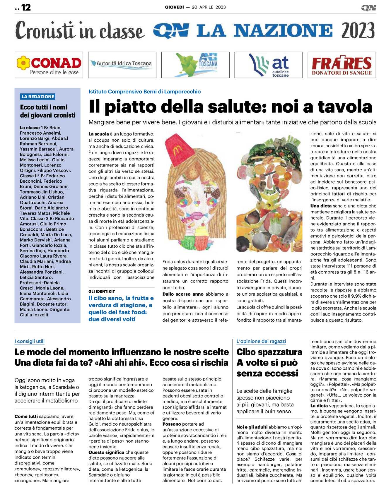 Uno degli ambiti in cui la nostra scuola ha scelto di essere formativa riguarda l’alimentazione, perché i disturbi alimentari, come ad esempio anoressia, bulimia e obesità, sono in continua crescita e sono la seconda causa di morte in età adolescenziale. Con i professori di scienze, tecnologia ed educazione fisica noi alunni parliamo e studiamo in classe tutto ciò che sta all’interno del cibo e ciò che mangiamo tutti i giorni. Inoltre, da alcuni anni, la nostra scuola organizza incontri di gruppo e colloqui individuali con l’associazione Frida onlus durante i quali ci viene spiegato cosa sono i disturbi alimentari e l’importanza di instaurare un corretto rapporto con il cibo.