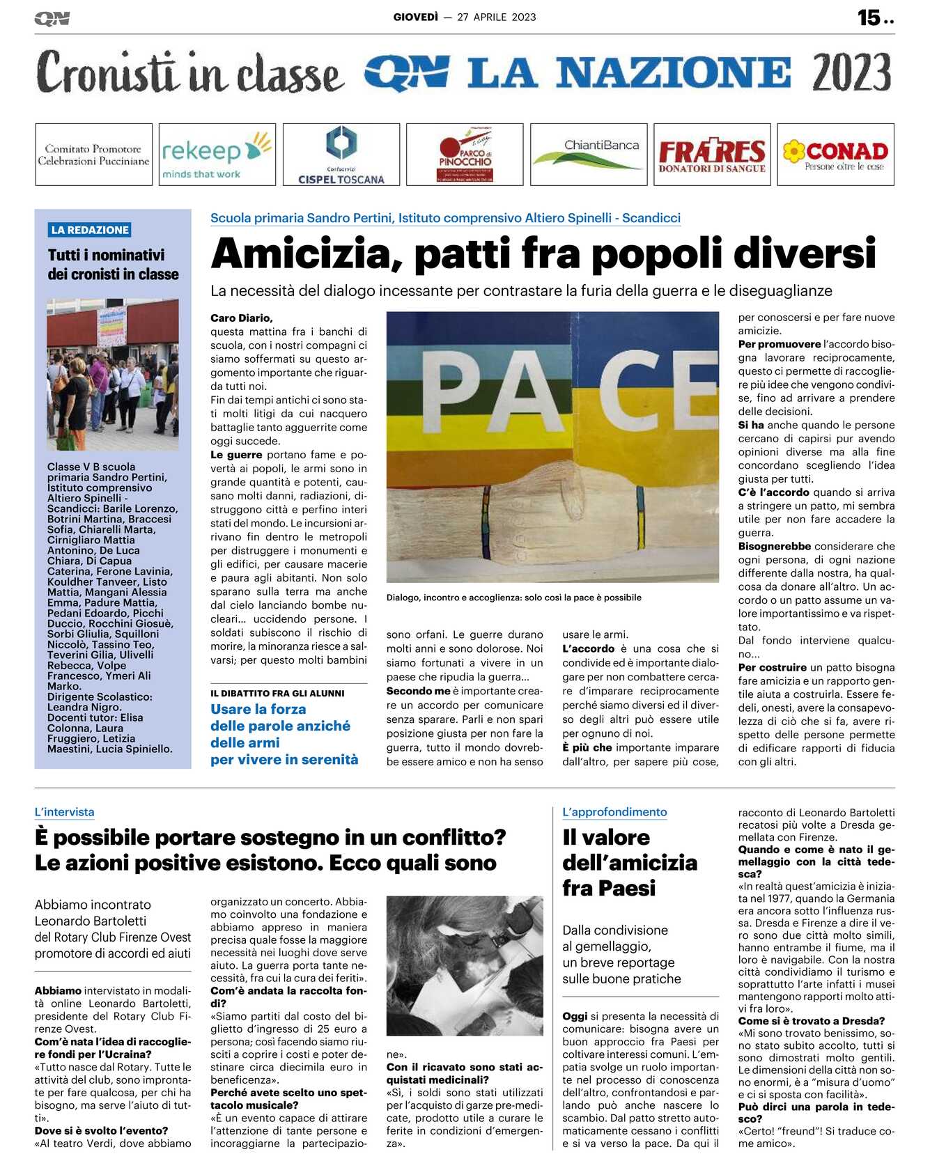 Oggi si presenta la necessità di comunicare: bisogna avere un buon approccio fra Paesi per coltivare interessi comuni. L’empatia svolge un ruolo importante nel processo di conoscenza dell’altro, confrontandosi e parlando può anche nascere lo scambio. Dal patto stretto automaticamente cessano i conflitti e si va verso la pace. Da qui il racconto di Leonardo Bartoletti recatosi più volte a Dresda gemellata con Firenze.