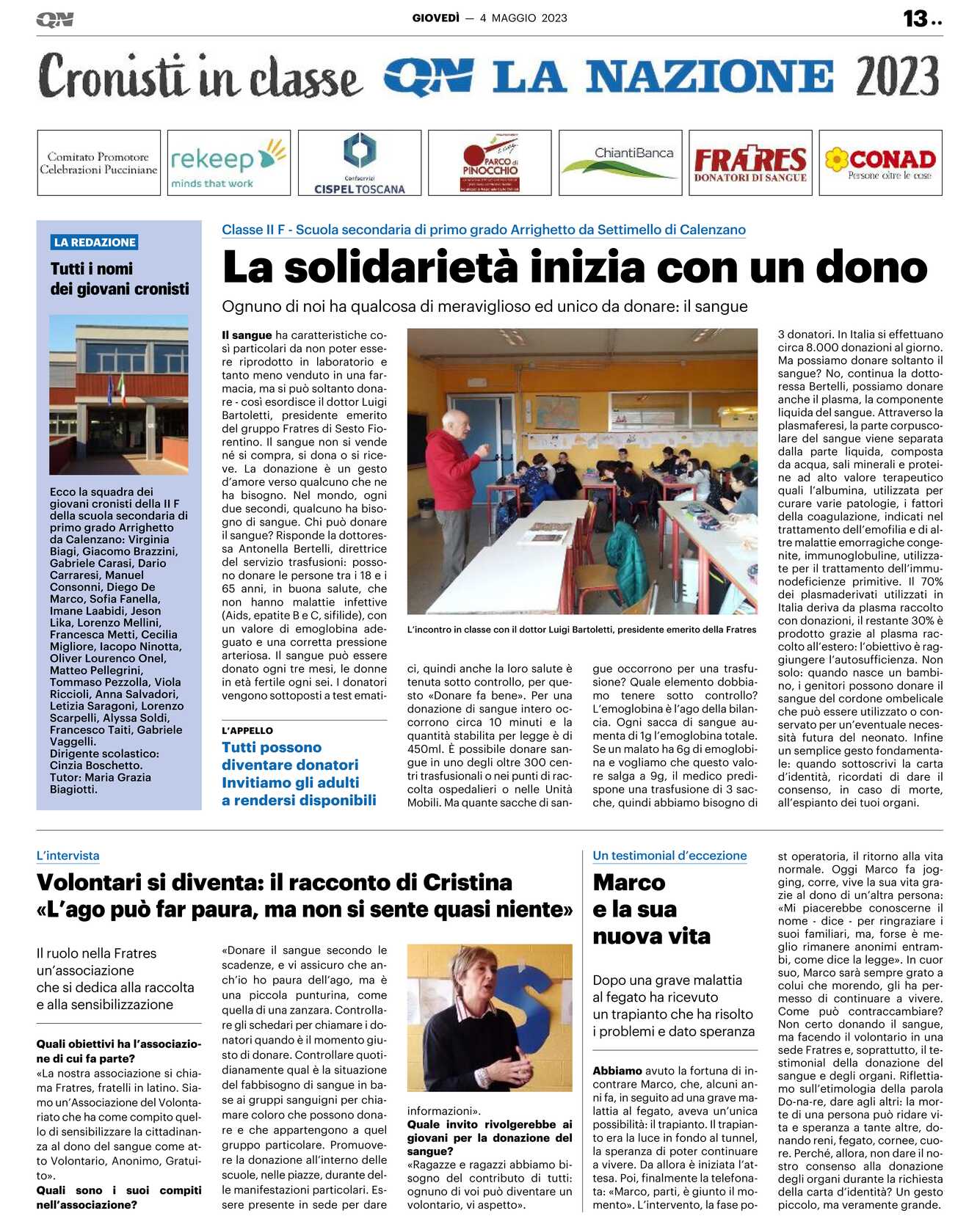 Quali sono i suoi compiti nell’associazione? «Donare il sangue secondo le scadenze, e vi assicuro che anch’io ho paura dell’ago, ma è una piccola punturina, come quella di una zanzara. Controllare gli schedari per chiamare i donatori quando è il momento giusto di donare. Controllare quotidianamente qual è la situazione del fabbisogno di sangue in base ai gruppi sanguigni per chiamare coloro che possono donare e che appartengono a quel gruppo particolare. Promuovere la donazione all’interno delle scuole, nelle piazze, durante delle manifestazioni particolari. Essere presente in sede per dare informazioni».